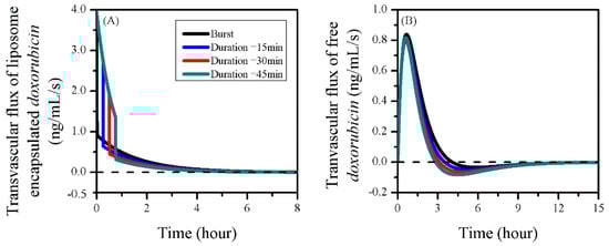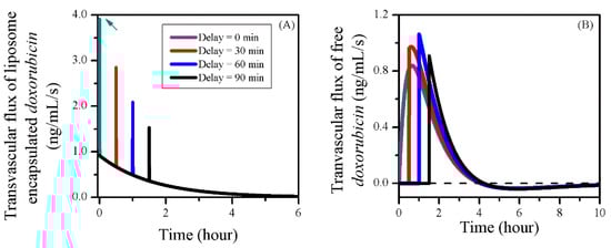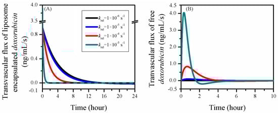 The time courses of drug transvascular flux in the treatments using liposomes with different release rates. (A) Liposome-encapsulated doxorubicin and (B) free doxorubicin.