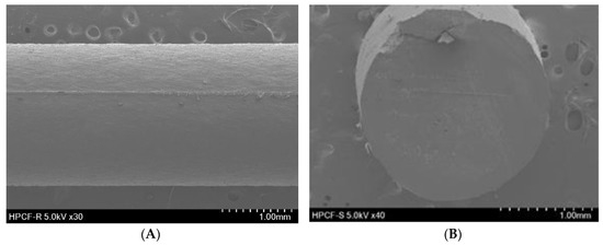 SEM images of hot-melt extruded filament. (A) Exterior appearance (30×) and (B) cross sectional shape (40×).