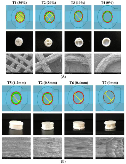 3D tablet design templates, tablet photographs, and SEM images of 3D printed tablet surface with (A) constant shell thickness (0.8 mm), different infill percentages (T1 30%, T2 20%, T3 10%, and T4 0%) and (B) constant infill percentage (20%), different shell thickness (T5 1.2 mm, T2 0.8 mm, T6 0.4 mm, and T7 0 mm).