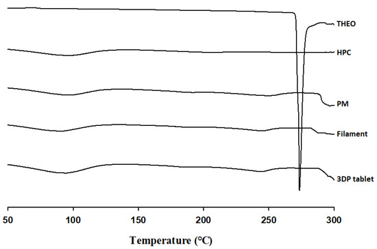 DSC was conducted to examine changes in the crystallinity of the bulk materials, the extruded filament, and the 3DP tablet during the thermal processes. As shown in Figure 3, THEO had a strong endothermic peak at approximately 275 °C, corresponding to its melting point. However, with the introduction of HPC, DSC thermograms were absent for the physical mixture (PM), filament, and the subsequent 3DP tablet. The absence of these peaks in the DSC thermograph may be due to the molecular dispersion of the THEO within the HPC polymer matrix, leading to reduced crystallinity that could not be detected with DSC. Therefore, PXRD was further employed for thermal analysis.