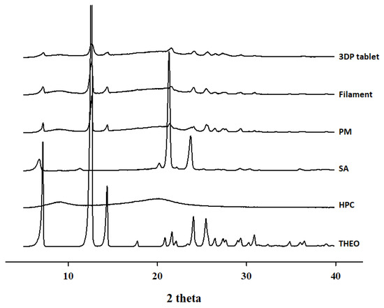 PXRD curves of 3DP tablet, THEO-HPC filament, PM, SA, HPC, and free THEO.