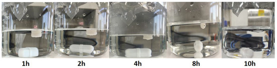 Photographs of 3DP tablet (T2) floating in dissolution medium (0.1 N HCl solution) at room temperature.