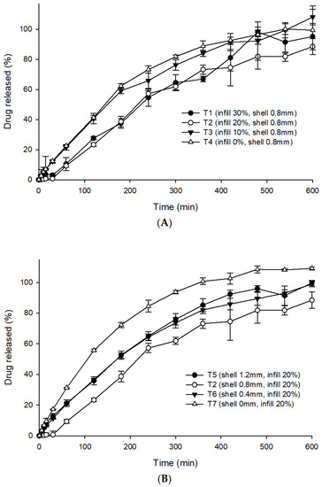 Drug release profiles of the 3DP tablets; (A) showing the influence of the infill percentages and (B) showing the influence of the shell thickness. Each value represents the mean ± standard deviation (n = 3).