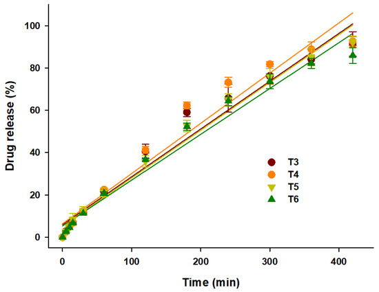 Linear fitting of drug release from T3, T4, T5, and T6 over 10 h.