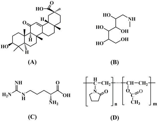 Chemical structure of glycyrrhetinic acid (A), meglumine (B), L-arginine (C), and Kollidon® VA64 (D).