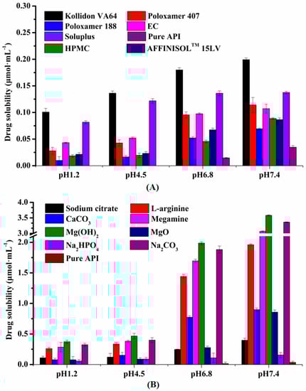 As shown in Figure 2A, API had the highest solubility in Kollidon® VA64, and it was selected as the polymer for this experiment. Moreover, the solubility of API increased significantly from the strong basicity of L-arginine, meglumine, Mg(OH)2, and Na2CO3 (Figure 2B). Therefore, Mg(OH)2, Na2CO3, meglumine, and L-arginine were selected as the alkalizers in this study.