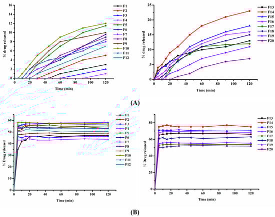 Dissolution of several formulations with different drug/alkalizer/polymer ratios. (A) Dissolution of F1–F20 in pH 1.2 HCl (n = 6). (B) Dissolution of F1–F20 in pH 6.8 buffer (n = 6).