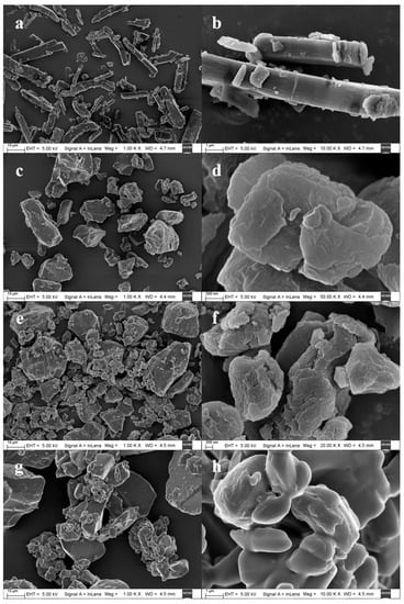 SEM was used to observe the changes in the surface morphology of the materials. GA crystals with a size of 5–20 μm are clearly distributed in Figure 4a,b, in the shape of a stick cube. By contrast, we did not find any GA crystals except large particles in all solid dispersions (Figure 4c–h). These phenomena suggested that the three raw materials were intimately and homogeneously combined in the TSD particles, and that the surface of the formulation particles was covered by Kollidon® VA64 macromolecules [].