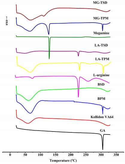 In this study, DSC was used to verify the physical state of the drugs in the formulation. Figure 5 shows DSC thermograms of GA, Kollidon® VA64, and their PMs/SDs with and without alkalizers. The DSC curves of pure GA, LA, and MG exhibit single endothermic peaks at 305, 228, and 129 °C, respectively, corresponding to their intrinsic melting points. By comparison, Kollidon® VA64, an amorphous polymer, exhibits no melting peak in its DSC curve. The characteristic melting point peaks of GA, LA, and MG exist in all physical mixtures. As expected, no melting peak of GA was observed in any solid dispersion. The characteristic melting point peaks of LA and MG exist in their SDs, but vary via their molecular interaction with other components []. Taken together, these results demonstrated that the BSD and TSD systems were in amorphous forms. It should be noted that when the crystallinity of a drug is under 2%, the melting peaks of the drug cannot generally be detected with DSC []. For this reason, further studies using PXRD were carried out to check the crystallinity of GA in the BSD and TSD systems.