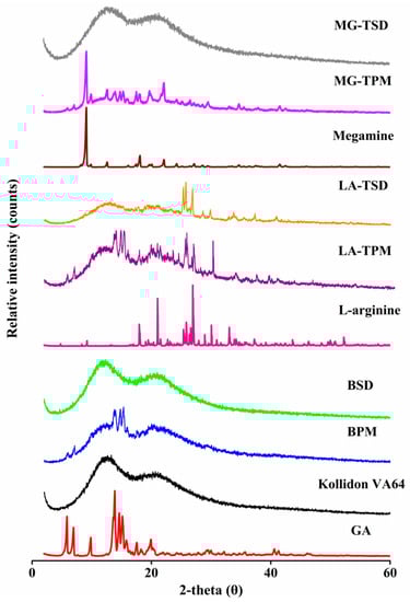 To further confirm whether BSD and TSD systems were in amorphous forms (as suggested by the low sensitivity of DSC as mentioned above), XPRD was employed as the most convenient and direct approach []. XPRD images of GA, Kollidon® VA64, and their PMs/SDs with and without alkalizers are given in Figure 6. The XPRD diffractogram of pure GA was highly crystalline, with many characteristic peaks. Similarly, typical high crystallinity peaks of LA and MG were observed. Kollidon® VA64 has a background pattern with two very wide peaks, indicating that Kollidon® VA64 exists in amorphous form. At the same time, the characteristic peaks of GA, LA, and MG were observed in their physical mixtures. The characteristic peak of GA was not observed in all SD formulations, indicating that the crystal transformation of GA occurred during hot melt extrusion. It is well known that polymers can inhibit crystallization and reduce the particle size to obtain better wettability, changing the form of the drug from crystallized to amorphous and preventing its recrystallization [,,]. However, the crystal form of the drug can be further induced to change to an amorphous form with alkalizers []. Unexpectedly, the characteristic peak of LA was found in LA-TSD, which may be related to its stable crystallization properties (the melting temperature is 223 °C and the decomposition temperature is 244 °C). Collectively, these results demonstrate that a 100% amorphous form could be achieved through the use of amorphous Kollidon® VA64 as the carrier, regardless of which alkalizers (L-arginine or meglumine) were used. Faster drug dissolution and greater solubility of the drug in an amorphous SD can be achieved by higher porosity, reduced particle size, improved wettability, and prevented recrystallization.