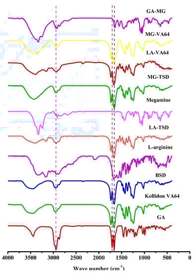As shown in Figure 8a,b, the peak near 3339 cm−1 is due to the N-H tensile vibration of the primary amine group in LA [], which is located at 3280 cm−1 in the LA-VA extrudate. The band at 3330 cm−1 corresponds to the secondary amine group in MG [], which vanished from the curve of the MG-VA extrudate. In addition, the absorption peak of Kollidon® VA64 at 3481 cm−1 was shifted to 3423 cm−1. A wide range of wavenumber shifts indicate that an ionic hydrogen bond formed between the alkalizers and Kollidon® VA64, with the (-NH2/-NH-) group protonated to (-NH3+/-NH2+-) [,,]. The protonated amino group in alkalizers is the hydrogen donor [,], while the C=O group of pyrrolidone in Kollidon® VA64 is a stronger hydrogen bond acceptor than the acetic acid group [,].