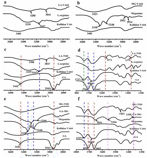 FT-IR spectra of GA, Kollidon® VA64, and their SDs with and without alkalizers in a specific wavenumber range. (a) FT-IR spectra of Kollidon® VA64, L-arginine and their extrudate in wavenumber range of 3700–2700. (b) FT-IR spectra of Kollidon® VA64, meglumine and their extrudate in wavenumber range of 3700–2700. (c) FT-IR spectra of GA, Kollidon® VA64, L-arginine and LA-TSD in wavenumber range of 3700–2700. (d) FT-IR spectra of GA, Kollidon® VA64, L-arginine and LA-TSD in wavenumber range of 1800–1300. (e) FT-IR spectra of GA, Kollidon® VA64, meglumine, GA-MG extrudate and MG-TSD in wavenumber range of 3700–2700. (f) FT-IR spectra of GA, Kollidon® VA64, meglumine, GA-MG extrudate and MG-TSD in wavenumber range of 1800–1300.