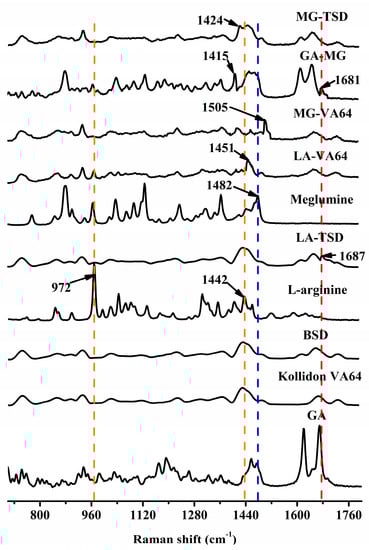As a supplement to FTIR, Raman spectroscopy further confirmed the ion pair effect between the drugs and alkalizers. The Raman infrared spectra are shown in Figure 9. The stronger band at 972 cm−1 and the weaker bands at 846 and 898 cm−1 are attributed to the deformation of the guanidine group in GA. Thus, the bands at 1653, 1569, 1444, and 1163 cm−1 belong to different deformation modes involving the N–H bond. Aliaga reached a similar conclusion by studying the surface-enhanced Raman scattering of arginine []. Furthermore, the peak of the primary amine group of LA (1442 cm−1) in the LA-VA64 extrudate appears at 1451 cm−1, and the peak of the secondary amine group of MG (1482 cm−1) in MG-VA64 extrudate is located at 1505 cm−1. The displacement of a larger wavenumber indicates that there is a hydrogen bond force between Kollidon® VA64 and the alkalizers. The peaks at 1415 cm−1, 1424 cm−1, 1681 cm−1, and 1687 cm−1 correspond to the asymmetric and symmetric stretching vibrations of the -COO− group. This is consistent with previous reports [,]. These results indicated that ion pair complexes formed between alkalizers and the deprotonated carboxyl group in GA.