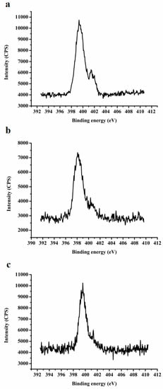 Spectrum of N1s in XPS of (a) LA-TSD, (b) GA-MG, and (c) MG-TSD.
