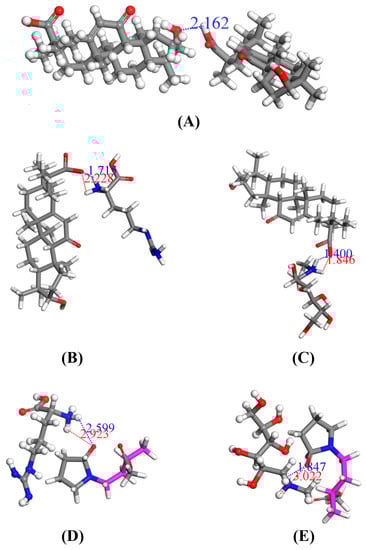 Molecular docking is often used to explain potential intermolecular interactions []. The use of molecular docking in this article explains how the ion pair complexes improve the dissolution rate and degree of GA in solid dispersion systems. Figure 11 shows the optimal molecular docking conformation between GA and GA, GA and alkalizers, and alkalizers and Kollidon® VA64. The H-bond distance between the two GA molecules is 2.162 Å and the binding energy is 10.612 kcal/mol. The distances between -COOH− of GAH+ and -NH3+- of MGH+ were 1.400 and 1.846 Å, respectively. Similarly, the distances between -COOH− of GAH− and (-NH2+-) of LAH+ were 1.715 and 2.228 Å, respectively. In addition, the binding energies of GA with MG/LA are −24.956 and −15.267 kcal/mol, respectively. In the same way, the distances between (-NH3+−) of MGH+ and Kollidon® VA64 were 1.847 and 3.022 Å, respectively, while the distances between (-NH2+-) of LAH+ and Kollidon® VA64 were 2.599 and 2.923 Å, respectively. In addition, the binding energies of Kollidon® VA64 with MGH+ and Kollidon® VA64 with LAH+ were −3.358 and 26.894 kcal/mol, respectively.