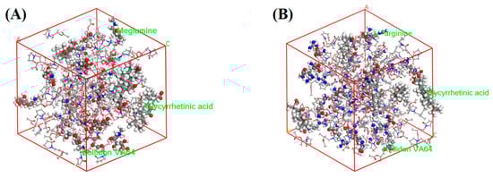 Molecular modeling was used to confirm the results of FTIR, Raman, and XPS. The crystal structures of the drugs and excipients were obtained from the Cambridge Crystal Data Centre (CCDC). Deposition Number(s): glycyrrhetinic (1319339), L-arginine (1578215), and meglumine (1225097) acid Materials Studio 2017 (Accelrys, San Diego, CA, USA) was used for molecular modeling, and a COMPASS force field was used to describe intermolecular interactions.