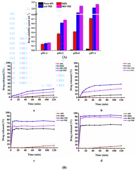 For the solubility study, excess amounts of the extrudates were added to 15 mL centrifuge tubes containing different media (pH 1.2, 4.5, 6.8, and 7.4). The aqueous solution was vigorously vortexed and placed in a shaking water bath at 75 rpm for 72 h at 37 °C. Then, the samples were centrifuged at 25 °C and 8500 rpm for 10 min to obtain a supernatant. Finally, the supernatant was filtered with a 0.45 μm water filter and diluted with the corresponding pH buffer. The absorbance at 252 nm was measured by spectrophotometry. The dissolution was studied with the SOTAX dissolution tester. API, BSD, MG-TSD, and LA-TSD were placed in 900 mL of different pH buffers at 37 ± 0.5 °C to determine the drug release. We used the paddle method at 75 rpm. Media (10 mL) was extracted after 5, 10, 15, 20, 30, 45, and 60 min, and an equivalent volume of fresh media was replaced. Samples were determined spectrophotometrically at a wavelength of 252 nm using a wavelength spectrophotometer.