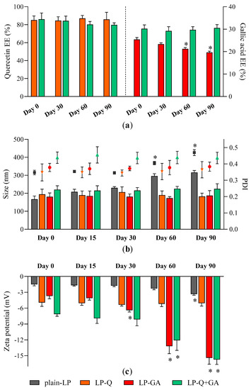 Stability of liposomes: changes in (a) Q and GA EE %; (b) liposomes size (bars, left Y axis) and PDI (symbols, right Y axis) and (c) zeta potential over a storage period of 90 days at 4 °C (mean ± SD, n = 4). The statistical significance was calculated with respect to day 0; * p < 0.05.