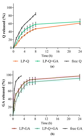 Q was efficiently entrapped both in LP-Q and LP-Q+GA (EE % >85%), as a consequence of its lipophilic nature that favors its incorporation inside the lipid bilayer. This is in agreement with the reported high EE % for Q in liposomes, ranging from 67% to 89%, [56,59,60,61]. Recently, Riva et al. [41] also demonstrated that the employment of phytosomes can increase the solubility of this polyphenol, thus promoting the entrapment of Q into the vesicles.