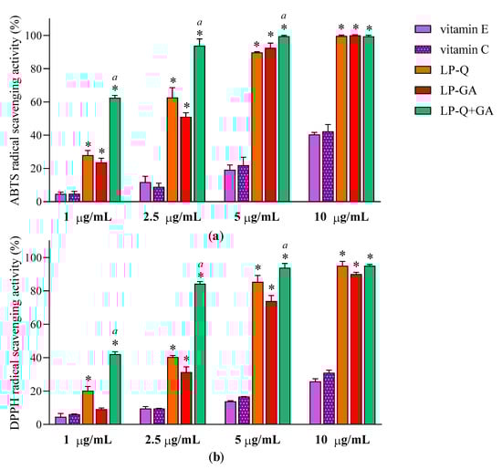 LP-Q, LP-GA and LP-Q+GA and plain-LP were serially diluted in ethanol and tested at various SPC concentrations (10–600 μg/mL), corresponding to Q and GA concentrations of 0.5–30 μg/mL. The activity levels of vitamin E and C were also tested under the same experimental conditions and used as controls for comparison.