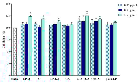 As previously observed [28,46], plain-LP exhibited a zeta potential close to neutral (Table 1) because phosphatidylcholine is a zwitter ionic lipid that can acquire slightly negative values in distilled water, as a result of the orientation of lipid headgroups and formation of a hydration layer around vesicles [47]. Liposomes incorporating Q and/or GA were more negative than plain-LP (p < 0.05), coherently with the fact that both Q and GA were negatively charged in water (−18.5 ± 0.6 mV and −14.3 ± 0.7 mV, respectively).
