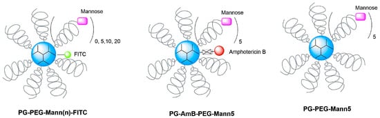 PG–PEG–Mann (with an approximate mannose-loading of 5, 10 and 20 molecules per PG), AmB–EMCH, maleimide-poly(ethylene glycol) (PEG–mal 2 kDa) and FITC were used as building blocks. The amine groups of PG–PEG–Mann were thiolated using 2-iminothiolane as a first step. Michael-type reactions were performed in a sequential manner to conjugate the different maleimide-bearing units to the thiolated PG–PEG–Mann, as described in Scheme 1B. For the reactions where the conjugates are labeled with FITC, the first step comprises a conjugation step without thiolation of the amine groups. Three series of PG–PEG–Mann derivatives were prepared, namely, PG–FITC–PEG–Mann(n), PG–AmB–PEG–Mann5 and PG–PEG–Mann5 (Figure 1).