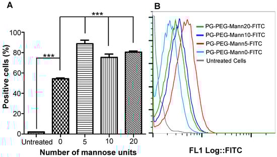 Cellular uptake of mannosylated nanocarriers was quantitatively investigated by flow cytometry. The amount of each sample internalized by cells should be proportional to the fluorescence intensity of FITC. Taken into account the amount of drug released after 24 h at pH 4.0; a fixed quantity of 100 μg/mL of each nanoparticle (PG–PEG–FITC) bound to different mannose units (0, 5, 10 and 20), was added to one-hundred and fifty thousand RAW 264.7 murine macrophages and incubated at 37 °C for 24 h. The incubation time for this cell line was optimized in a previous report by the authors, using similar type of nanocarriers [26]. All mannosylated PG–PEG–FITC nanocarriers included in this study were significatively internalized by RAW 264.7 cultures within the first 24 h. Functionalization with only five mannose units (PG–PEG–Mann5–FITC) showed the maximum significant uptake. In addition, 10 and 20-mannose decorated nanocarriers have also shown significant uptake (Figure 2A). Figure 2B displays a representative flow cytometry histogram where the MFI illustrates fluorescence inside cells. These results are consistent with previous reports demonstrating the role played by mannose density on nanoparticle uptake by binding to mannose receptor CD206 externally displayed by macrophage [51,52,53].