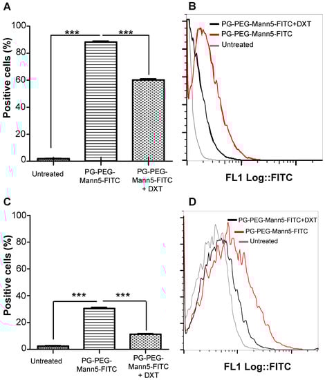 In order to know whether the internalization of mannosylated nanocarriers was dependent on CD206 receptor, RAW 264.7 macrophages were preincubated for 30 min with 5 mg/mL dextran (DXT), a demonstrated competitor of CD206 [54]. PG–PEG–Mann5–FITC nanoparticle was added to cultures as above. Figure 3A,B show much greater cellular uptake of the nanoparticle in the dextran-free (88.4%) than in the dextran-containing medium (60.35%). Based on these results, the presence of dextran in the medium prevented PG–PEG–Mann5–FITC from entering into the RAW 264.7 macrophages by competitively binding to the CD206 receptor on cell surface, indicating that PG–PEG–Mann5–FITC was mostly internalized through mannose receptor-mediated endocytosis.
