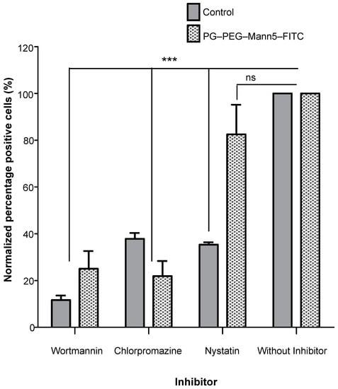 Figure 4 shows that in RAW 264.7 macrophages, the inhibition of macropinocytosis and phagocytosis by wortmannin led to 74.94% reduction on the uptake of PG–PEG–Mann5–FITC. Likely, the inhibition of clathrin-mediated endocytosis by chlorpromazine led to 78.08% reduction on the nanoparticle uptake. In both endocytic pathways, positive controls with beads and transferrin confirmed the applied inhibition protocol with 90.38% and 64.68% reduction, respectively.
