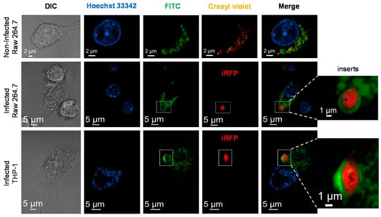 RAW 264.7 or THP-differentiated macrophages were seeded at a density of 6 × 104 cells/mL in 8-well Ibidi (Germany) coated plates. After incubation with 300 μg/mL nanoparticles for 24 h, cells were washed twice with 37 °C prewarmed PBS. Cells were stained with 2.5 µg/mL Hoechst 33342 dissolved in culture medium. Then, 1 μM cresyl violet was also added for 5 min to visualize the acidic compartments [36]. Live macrophages were imaged by using a Zeiss LSM800 confocal microscope Intracellular amastigotes were visualized using a and standard Cy5.5 filter set (665/45 nm exciter and 725/50 nm emitter).