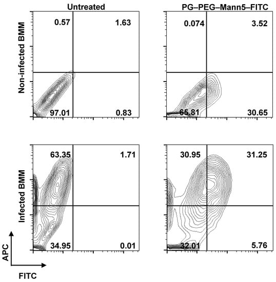 Right top panel in Figure 6 shows that 33% (30.65 + 3.52) of uninfected macrophages were positive for FITC, meaning that one-third of population have internalized the mannosylated-NPs. When the experiment was performed with iRFP-L. infantum-infected macrophage cultures, the colocalization of NP with fluorescent parasites allow us to know how the distribution of NP between the population is, since not all macrophages in the well culture are infected. Left bottom panel in Figure 6 shows that 63% of macrophages were positive for allophycocyanin (APC), meaning that they were infected, versus 34% uninfected macrophages (negative for APC). The treatment for 24 h with PG–PEG–Mann5–FITC, led to half of infected macrophages (31.25/63.35) internalized the NP (31.25% positive for APC and FITC), whereas the internalized NP by uninfected macrophages was only 5.76% (negative for APC and positive for FITC), which represented 16% population (5.76/34.95). Collectively, these results confirm that L. infantum-infected macrophages have higher avidity for mannosylated nanocarriers than non-infected macrophages. Our outcomes agree with recently results where bivalent mannosylated nanocarriers have been demonstrated to utilize the CD206 receptor as portal for entry in alternative differentiated macrophages or M2 [60]. This phenotype could be induced either by IL-4/IL-13 macrophages treatment or leishmania infection, which would justify the use of mannosylated carriers for drug delivery in leishmania. Macrophage polarization from M1 to M2 was described in other intracellular pathogens such as Mycobacterium tuberculosis during the formation and development of tuberculous granulomas [61], Candida albicans [62] and Salmonella typhimurium [63].