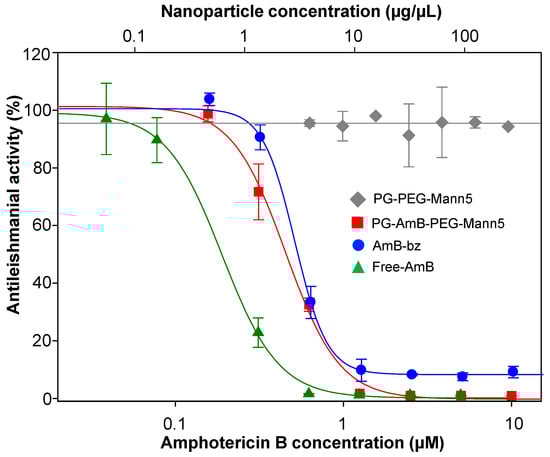 Vehicle-treated wells (0.4% DMSO) and 300 μg/mL PG–PEG–Mann5 were used as negative controls. After 96 h incubation, we used an Odyssey imaging system (Li-Cor) to obtain infrared fluorescence measures to calculate IC50 values by using SigmaPlot 10.0 software. Figure 7 shows that both AmB-bz and PG–AmB–PEG–Mann5 had similar IC50 values (0.43 ± 0.03 µM and 0.48 ± 0.01 µM, respectively), which was twice the IC50 value for free-AmB (0.20 ± 0.02 µM), while the empty nanoparticle PG–PEG–Mann5 was inactive. Both, AmB-bz (the ester-derivative of AmB at the glucosamine position) and PG–AmB–PEG–Mann5 showed slightly lower antileishmanial activity than free-AmB. However, as we stated above, PG–AmB–PEG–Mann5 would be preferentially internalized by infected cells which would reduce the toxicity of AmB in other non-infected cells. Despite the current efforts done by pharma industry and academia in searching for better treatments against leishmaniasis, most of candidates drop the race due to the peculiar scenario displayed by this disease (parasites reside in intracellular organelle and multiple organs are affected), which make even more difficult to address issues as toxicity and biodistribution [64].