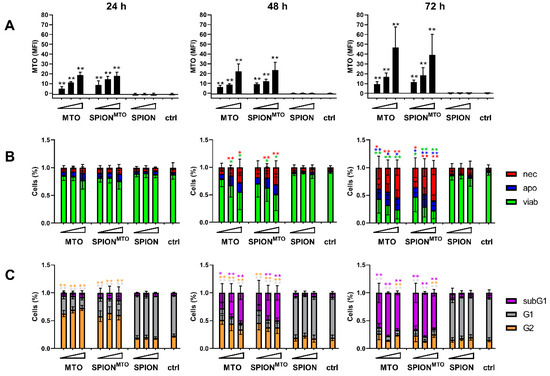 MTO uptake, cell cycle and cell death induction. HT-29 cells were treated with SPIONs, MTO, or SPIONMTO for 24 h, 48 h, and 72 h. MTO concentrations of 0.5, 1.0 or 2.0 µM (see triangle) and equivalent SPION concentrations were administered according to Table 2. H2O-treated cells served as controls. (A,B) Cells were stained with Annexin A5-FITC or -APC (Ax) and propidium iodide (PI) and analyzed via flow cytometry. (A) The mean fluorescence intensity (MFI) of viable cells (Ax− PI−) was used to quantify intracellular MTO. (B) Ax− PI− cells are considered viable (viab), Ax+ PI− are considered apoptotic (apo) and Ax+ PI+ are considered necrotic (nec). (C) Cell cycle was analyzed by PI-Triton staining in flow cytometry. G1 reflect cells with diploid DNA content, G2 reflect cells with double diploid DNA content, and subG1 are cells with degraded DNA. Shown are mean values of three independent triplicates with standard deviations. Significances were calculated using Student´s t-test for treatment groups versus control and MTO versus SPIONMTO (* p < 0.05; ** p < 0.01).