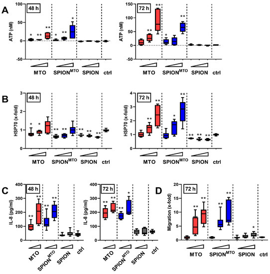 Release of damage-associated molecular patterns (DAMPs) from dying cells. The supernatants of cells which had been treated with SPION, MTO or SPIONMTO for 48 h or 72 h were analyzed via ATP-mediated chemiluminescence (A), HSP70 ELISA (B) or IL-8 bead-based immunoassay (C). (A,B,D) 0.5, 1.0 or 2.0 µM MTO and corresponding iron amounts were used according to Table 2 (see triangle); (C) 1.0 and 2.0 µM MTO were applied. (D) Supernatants were used as chemoattractant for THP-1 monocytes. Data represent number of THPs migrating towards the supernatant. The supernatant from H2O-treated cells served as control. Shown are the mean values and standard deviations of three independent (A,B,D) or two independent triplicates (C), respectively. Significances were calculated using Student’s t-test comparing treatment versus control group and MTO-treated cells versus SPIONMTO-treated cells (* p < 0.05; ** p < 0.01).