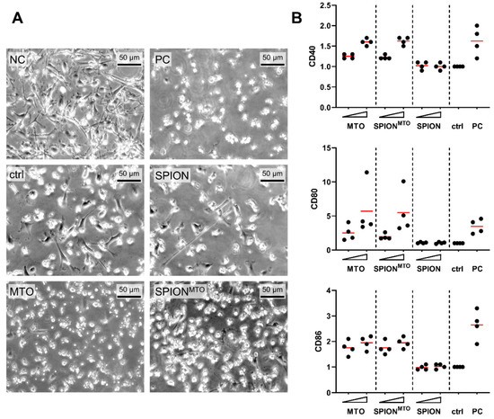 Maturation of dendritic cells after co-incubation with supernatants of HT-29 cells. Supernatants of HT-29 cells which had been treated for 72 h with SPION, MTO and SPIONMTO (MTO concentration 1.0 µM and 5.0 µM and corresponding SPION concentrations, see Table 2) were co-incubated with monocyte-derived immature dendritic cells (iDC) from four healthy donors. After 24 h of co-incubation, the expression of the activation markers CD40, CD80 and CD86 were analyzed using flow cytometry. Untreated iDC in HT-29 medium (NC), matured DC (mDC) in HT-29 medium (PC) and iDCs in supernatant from H2O treated HT-29 cells (ctrl) served as controls. (A) Light microscopic pictures of DCs incubated with supernatant of HT-29 cells treated with 1 µM MTO and corresponding concentrations of SPION and SPIONMTO. (B) Each donor was tested at least as duplicate and each mean value was normalized to the untreated control. Every dot represents the mean value of one donor, the red line the mean of all donors.