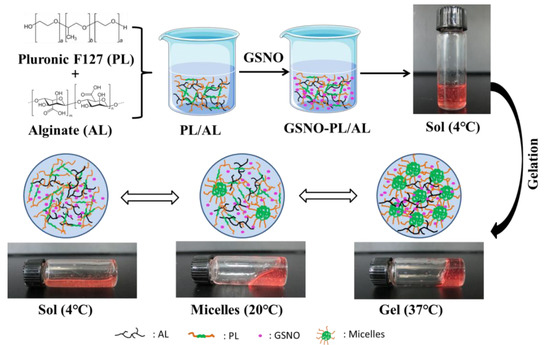 Schematic diagram of GSNO-PL/AL hydrogel synthesis and sol−gel transition. AL: alginate, GSNO: S-nitrosoglutathione, PL: pluronic F127.