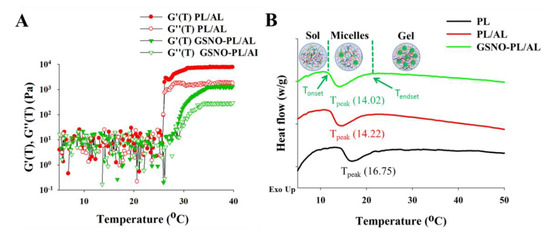 Changes of the rheological properties of PL/AL and GSNO-PL/AL hydrogels with the temperature were investigated using a Rotational strain-controlled rheometer (Advanced Rheometric Expansion System (ARES), Rheometric Scientific, Piscataway, NJ, USA) equipped with a parallel-plate fixture with a radius of 25 mm an angular frequency of 1.0 rad/s, and a gap size of 0.5 mm. The temperature sweep analysis was performed in the range of 5–40 °C with a heating rate of 1 °C/min. Before experiment initiation, samples were rested for 10 min after loading on the plate for stabilization.