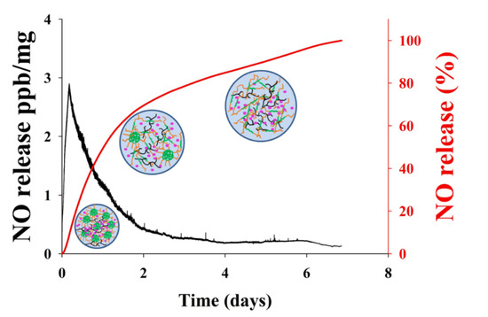 Nitric oxide (NO), a diatomic free radical, is a cell-signaling molecule that is constitutively expressed in endothelial cells through the enzymatic conversion of L-arginine by nitric oxide synthase (NOS) [1]. The physiological roles of NO include neurotransmission, wound healing, blood pressure regulation, platelet adhesion, and immune response [2,3,4,5,6,7]. Likewise, NO also has strong efficacy against a wide range of Gram-positive and Gram-negative bacteria and plays a vital role in wound healing by modulating cell proliferation, wound contraction, and collagen deposition [8,9,10].