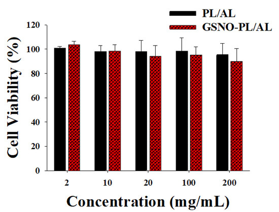 The MTT assay was performed to evaluate the cytotoxic effect of the GSNO-PL/AL hydrogel against mammalian cells using the L929 murine fibroblasts. As shown in Figure 4, the PL/AL hydrogels did not show significant cytotoxicity (over 90% of cell viability) up to 200 mg/mL, due to the biocompatible nature of PL and AL. An injectable PL scaffold has been used for tissue engineering. The viability of the L929 after the encapsulation process increased up to 106% on the 5th day of encapsulation [32]. The GSNO-PL/AL also exhibited lower cytotoxic effects, thereby demonstrating no evident cytotoxicity of the GSNO inside the GSNO-PL/AL of the L929 cells. As shown in our previous reports, GSNO was cytotoxic to L929 cells [18]. The inhibition of GSNO cytotoxicity in GSNO-PL/AL was due to the controlled release of NO. As illustrated in Figure 3, GSNO-PL/AL releases NO in a sustained manner over 7 days, thus protecting the cells from exposure to a high amount of NO, thereby implying that NO released from GSNO-PL/AL is safe for topical application. The results indicated that the composite hydrogel was not cytotoxic when applied in wound healing.