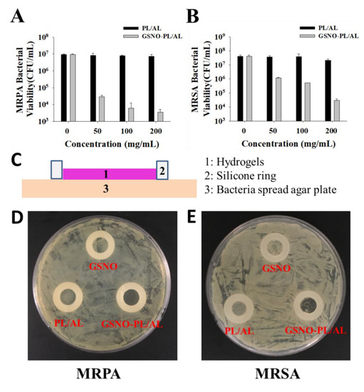 In vitro antibacterial activities of PL/AL and GSNO-PL/AL hydrogels against (A) multidrug-resistant Pseudomonas aeruginosa (MRPA) and (B) methicillin-resistant Staphylococcus aureus (MRSA). (C) Side-view schematic of antimicrobial study configuration using agar plate with bacterial growth. Macroscopic images of antibacterial activities on the agar plate against (D) MRPA and (E) MRSA.