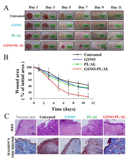 (A) Representative photographs of healing burn wounds infected with MRPA in mice treated with PL/AL and GSNO-PL/AL. (B) Area reduction (%) profiles of MRPA-infected wounds. Data are presented as means ± SD; n = 6. * p < 0.05 vs. untreated. (C) Histological analysis (hematoxylin and eosin (H & E) and Masson’s trichrome staining) of MRPA-infected wound at 11 days after injury. Bar = 100 µm.