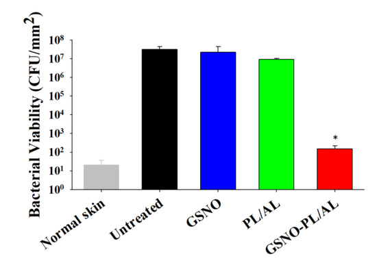 We evaluated the reduction in bacterial burden in wounds based on CFU counts. After treatment with free GSNO solution, no antibacterial activity was observed. Figure 7 shows that the PL/AL-treated group exhibited ≈1 log reduction in bacterial viability. However, an insignificant bacterial load was detected in the GSNO-PL/AL group. This finding was consistent with the results of the in vitro bactericidal activity assay.