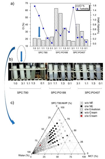 Formulation studies for assessing the surfactant composition: SPC:T80, SPC:PO188, SPC:PO407. (a) Creaming index (CI) and Turbidity of different emulsions; (b) Images of each tested formulation; (c) Pseudo-ternary phase diagram using the SPC:T80 (3:1 w/w).