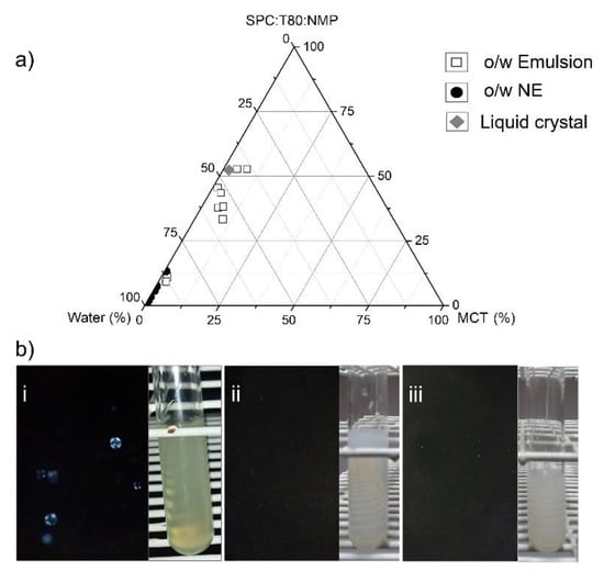 In previous studies, our team has already assessed the phase transition of lyotropic lamellar liquid crystals as a strategy to obtain small and uniform droplet sized NEs [26,35]. The self-assembly behavior of surfactants in the oil/water interface depends on a fine and limited phase equilibrium. An optimum water addition could induce phase transitions to NEs. The suitable dilution of the gel-like system identified in the second diagram corroborated to this assumption in Figure 2bii. Furthermore, this method produced small droplet sized NE formulations with remarkable low PdI values (Table 2).