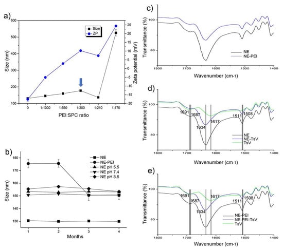 Effect of PEI covering and TsV-loading on the physicochemical properties of the NE formulations. (a) Effect of PEI content on the size and zeta potential (ZP); (b) Stability and robustness of NE from pH changes; (c–e) Effect of the composition on the FTIR spectra of distinct NEs: (c) PEI addition; (d) NE-TsV loading; (e) NE-PEI-TsV-loading.