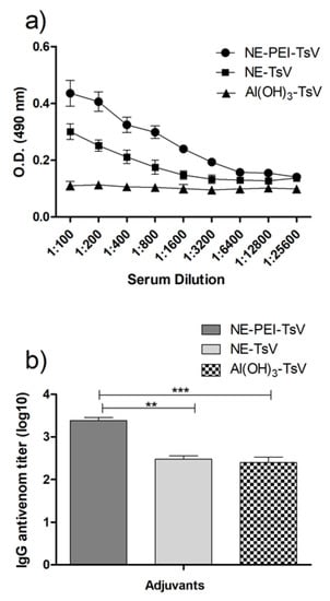 Finally, the in vivo potential of the loaded NE and NE-PEI as adjuvants for antiserum production against TsV was evaluated and compared to the Al(OH)3 adjuvant. Figure 5a showed the evaluation of antibody profile for the animals immunized with each sample. Differences can be observed among the optical density observed for the three formulations. As hypothesized, this experiment corroborated to the expected improved adjuvant activity for the TsV-loaded NEs. A superior performance was observed for the NE and NE-PEI compared to the Al(OH)3 traditional adjuvant. (Figure 5a). The Al(OH)3 adjuvant is quite potent and used in considerable number of approved vaccines, which still has an adjuvant to be overcome. In addition, aluminum is the most common formulation for serum production in antivenom protocols. We can observe several studies in the literature in which the response of nanocarrier was not better that aluminum salt or should be associated with it to induce a similar response. In a previous study, we have demonstrated that chitosan NPs was capable to induce a statistically similar IgG titer to Al(OH)3, but not superior [53]. Thus, not all nanocarriers are capable of enhance IgG titers, which for antivenon serum are essential for neutralizing the toxins. Nanocarriers as adjuvants may act, in some cases, stimulating the immune response by different mechanism other that immunoglobulins production. Therefore, the adjuvant response depends not only on the use of nanocarriers, but by on their size, shape, hydrophobicity, and charge of particles, which can be tailored.