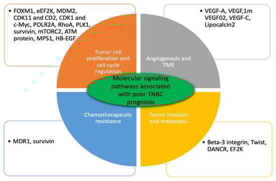 Both tumor growth and metastasis are driven by angiogenesis [111]. Tumor angiogenesis is characterized by high neovascular density, high lymphatic density, and vascular invasion. Numerous angiogenic factors are secreted in the tumor microenvironment stimulating new blood vessels sprout. Angiogenic factors overexpression is correlated with cancer development as vascular endothelial growth factors (VEGF) especially VEGF-A subtype, attributed for cancer progression such insulin like growth factors (IGF) and TGF-β1 and concerned with tumor invasion and metastasis like vascular endothelial growth factor receptors (VEGFRs) [112]. These proangiogenic factors are more pronounced in TNBC compared to other subtypes of breast cancer [111,113].