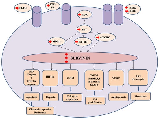 Survivin is a potential target for treatment patients with TNBC. Activation of several kinases such as HER2, HER3, IGF-1R and EGFR elicits PI3K/AKT signaling pathways resulting in upregulation of survivin expression. Overexpression of survivin stimulates numerous genes and proteins associated with cancerous cell proliferation and survival, migration, angiogenesis, and promotes chemoresistance.