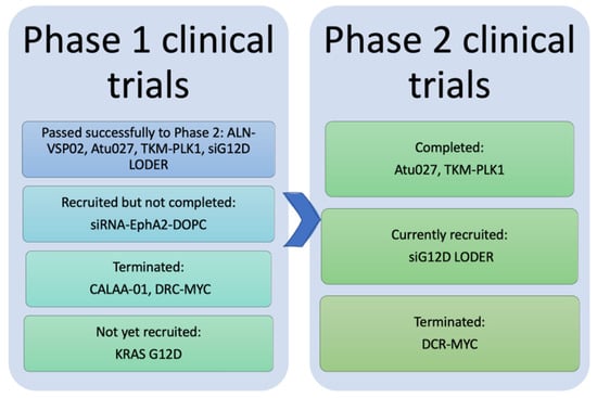 Representative diagram for the results of phase I and phase II clinical trials of the eight anticancer nano-siRNAs. Phase I trials of CALAA-01 and DCR-MYC were terminated. The phase I trial of siRNA-EphA2-DOPC has recruited but not completed yet, whereas the mesenchymal stem cell-derived exosomes with KRAS G12D trial has not yet recruited. ALN-VSP02, Atu027, TKM-PLK1, and siG12D LODER passed phase I successfully. Four siRNA nanotherapeutics moved to phase II; Atu027 and TKM-PLK1 completed phase II while siG12D LODER is currently being recruited. The phase II trial of DCR-MYC was terminated.