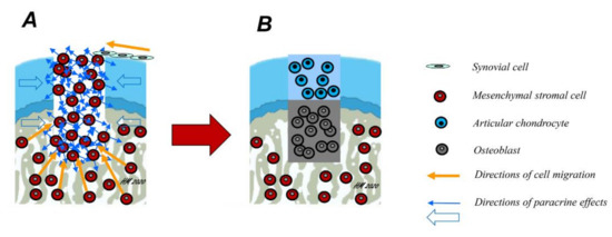 Emerging treatments include cell-based and acellular, scaffold-based tissue engineering and gene therapy. The standard cell-based therapy to repair cartilage defects is the autologous chondrocyte implantation (ACI), with good long-term outcomes [8]. Mesenchymal stromal/stem cells (MSCs) from the bone marrow or from connective tissues like fat are being pursued as alternatives for cartilage repair and are applied via intra-articular administration in patients with knee OA. Early-phase clinical studies provide some promising insight into their efficacy, but the mechanisms of action involved remains unclear [9].